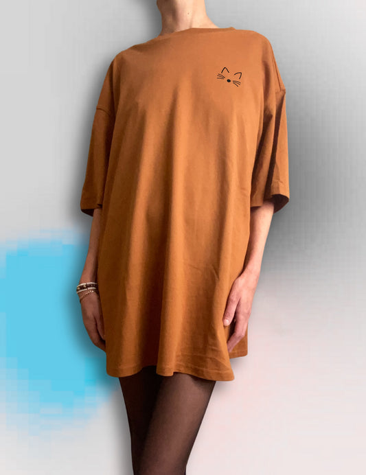 CAT, T-Shirt Kleid, Toffee, kurzes Oversized Kleid mit Micro Katzen Print, orange-braun, schwarz