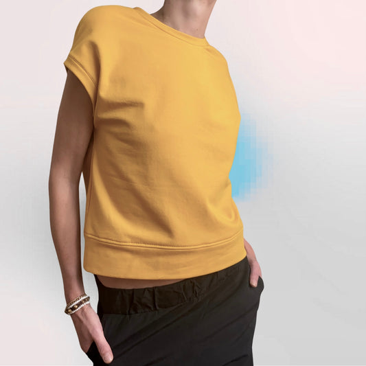 Kurzarm-Sweater02, kuschelig weiches Sweatshirt, Mustard, mit überschnittenen Schultern, cosy Sweater
