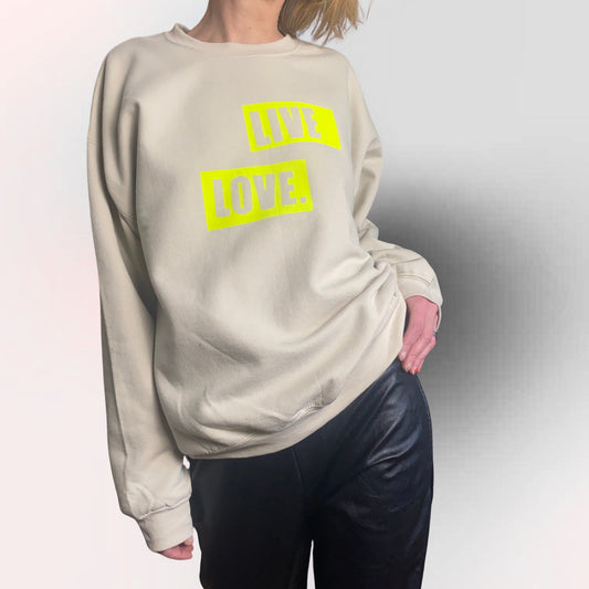 Crewneck Sweatshirt mit Neonprint, Oversized Sweater, Sand, Neongelb, mit Siebdruck auf der Vorderseite, LIVE, LOVE
